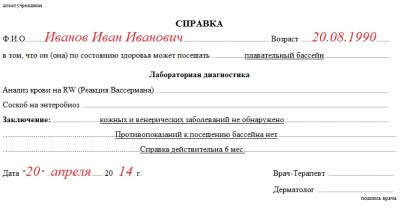 Классическая мед справка в бассейн выдается после проведение стандартных исследований: